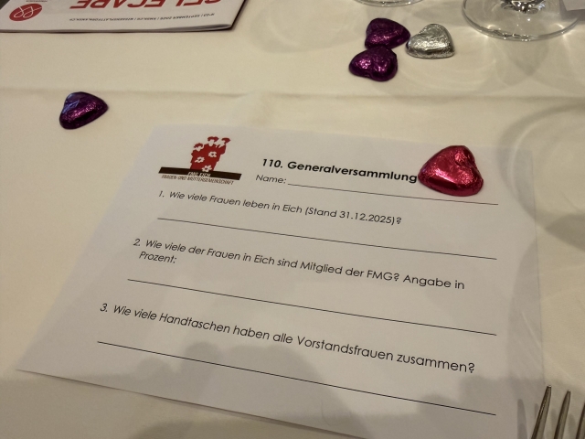 Für die 110. Generalversammlung der Frauen – und Müttergemeinschaft Eich (nachfolgend FMG Eich) fanden sich am 11. März 2026 80 Mitglieder und Gäste im Hotel Restaurant Vogelsang ein. 110 Jahre sind eine beeindruckende Zahl und widderspiegelt den unermüdlichen Einsatz der Frauen aus Eich. Die Co-Präsidentinnen Daniela Thürig und Veronika Aregger führten wie immer sehr kompetent, sympathisch und speditiv durch die Versammlung. Auch ein positiver Rechnungsabschluss von CHF 404 konnte präsentiert werden. Die Jahresrechnung, der Revisionsbericht und die Jahresberichte wurden von der Versammlung ohne Einwände genehmigt. Auch alle anderen Geschäfte wurden von der Versammlung
